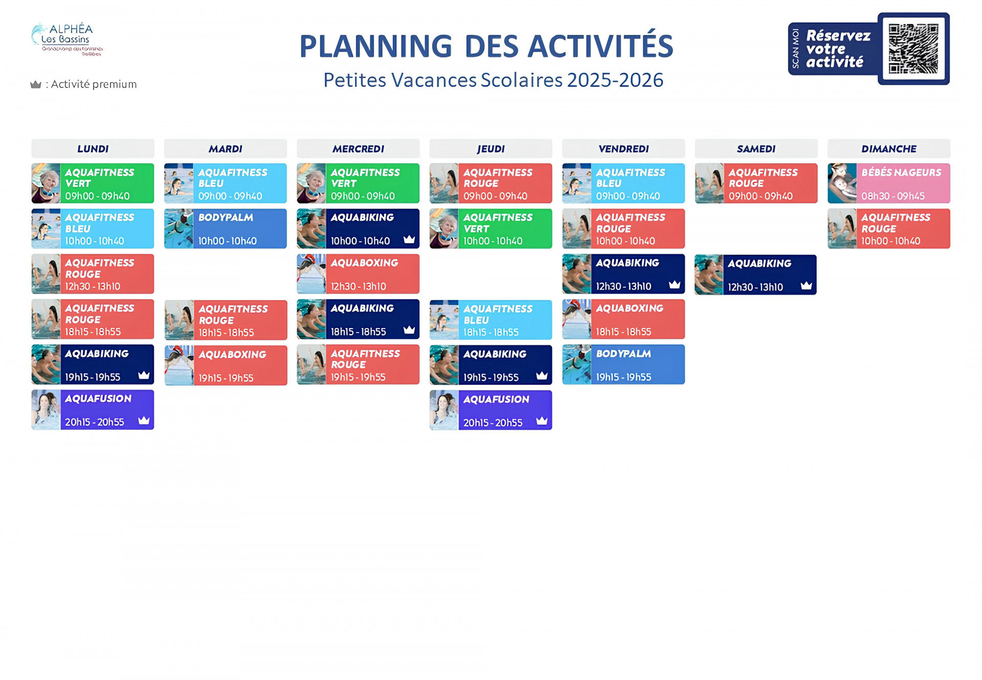 Bassin sportif : 09:00 - 13:15 et 14:30 - 18:00 | Bien-être : 09:45 - 13:15 et 14:30 - 18:00 | Bassin ludique : 10:00 - 13:15 et 14:30 - 18:00